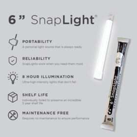 SnapLight is Industrial Grade light stick, it is waterproof and non-flammable. The light stick has a hook and hole top for hanging, attaching or stringing the lights together. To activate SnapLight, simply bend, snap and shake to immediately flood your surrounding area with functional light. Each SnapLight measures 6” long, 10 sticks per pack. Each light stick is individually foil-wrapped for protection from light and moisture and boasts a five-year shelf life from date of manufacture.