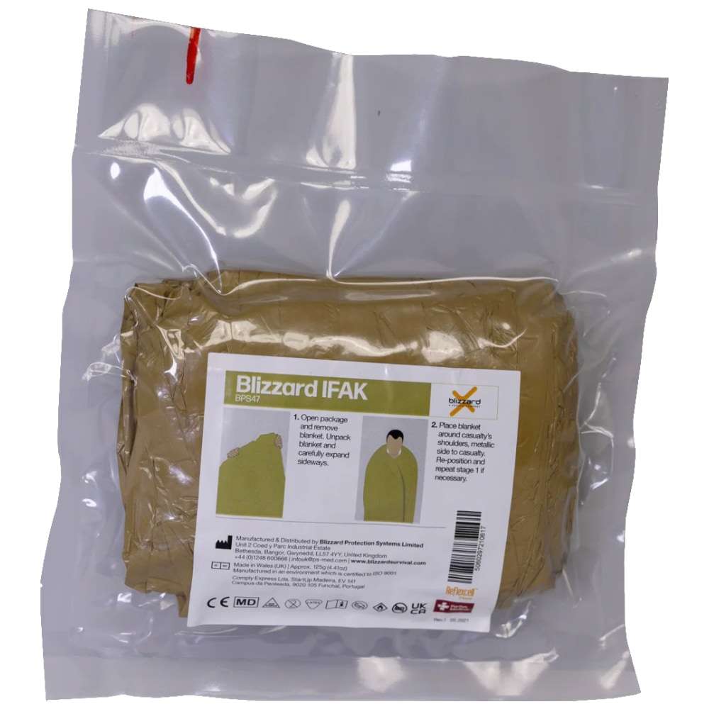 The Blizzard IFAK 2-Layer Blanket is a purpose-built hypothermia prevention solution designed for Individual First Aid Kits (IFAKs), tactical med kits, and emergency response applications. Engineered to reduce heat loss in trauma situations, this compact blanket plays a critical role in casualty care where maintaining core body temperature is essential for survival.